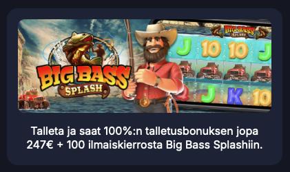 - 1. talletus: 100 % bonus 247 € asti ja 100 ilmaiskierrosta (Big Bass Splash)