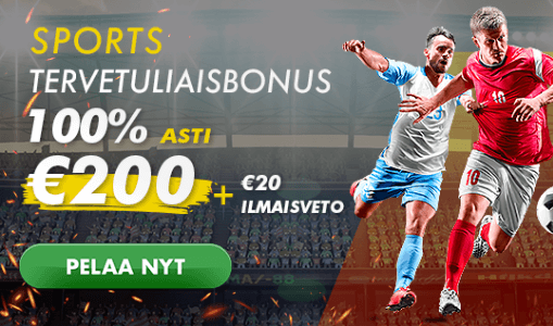 Mikäli urheiluvedonlyönti on enemmän sinun heiniäsi, voit vaihtoehtoisesti napata urheiluvedonlyönnin tervetuliaisbonuksen. Tällöin saat sekä 100% talletusbonuksen 200€ asti että 20€ ilmaisvedon.
