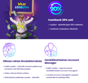 Loyalty+ on kasinon oma uskollisuusohjelma, joka palkitsee aktiivisen pelaamisen. Palkintona on esimerkiksi 20% cashback, ja lisäksi voit napata itsellesi esimerkiksi oman tilinhoitajan ja kierrätysvapaita rahapalkintoja.