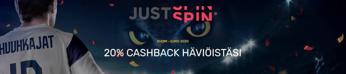 Justspin Casino tarjoilee EM-kisoihin liittyvän mainion bonuksen. Jos ja kun Huuhkajat etenee alkulohkostaan jatkoon ja olet tallettanut bonuskoodilla "SUOMI" kampanjan aikana – saat 20% käteispalautuksen tappiollisille talletuksillesi.